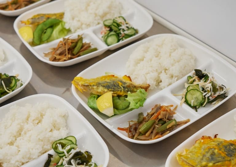 寝屋川市内の福祉事業所で調理している栄養バランスの整った給食が温かいうちに毎日けいけいへ届けられ、直前に配膳して提供しています。