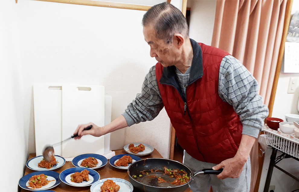 なかまは朝8:30頃に泉州聴覚障害者センターなんなんに通所するため送迎バスに乗車し、夕方5:00頃にホームに戻ります。仕事から帰るとそれぞれ日替わりで担当が決まっており、世話人と一緒に夕食準備を行います。